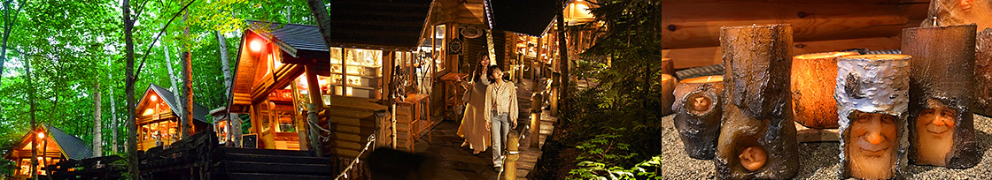 A romantic shopping area in the forest adjacent to the Shin Furano Prince Hotel. Log cabins dotted throughout the forest sell products that are unique to each store and available nowhere else.