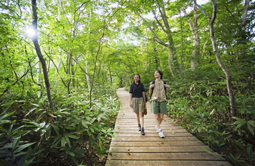Fuji Rock Festival is an outdoor music festival held in Naeba. Since 2002, with the help of local volunteers, we have built the Naeba Boardwalk here to create a barrier-free wooden walkway which wheelchairs can use to enjoy nature. The 1.5km path winds a way through the forest and continues to be expanded today, acting as part of nature preservation efforts around the area.