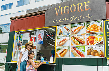 Glance at the alpine scenery while relaxing in the fresh air. Light snacks such as hot dogs and fried chicken are available.