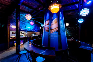 Inside the restaurant, a starry sky commentary movie is projected and projection mapping is projected to learn about planets and space.