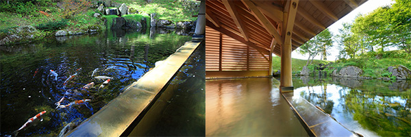 This is an atmospheric open-air hot spring bath where you can experience the four seasons: fresh greenery in spring, deep green in summer, autumn leaves in fall, and an open-air bath for viewing snow in winter. Watch up close as carp swim in the pond that is right next to the bath.