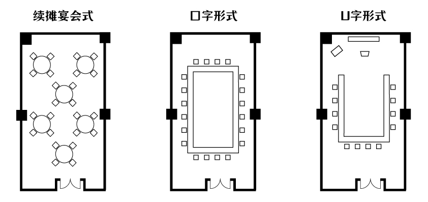 晚宴式 (圆桌) 48 晚宴式 (长桌) 24 站立式自助餐 40 设座式自助餐 30 剧院式 70 研讨会式 56 口字形式 32 U字形式 24 续摊宴会式 50