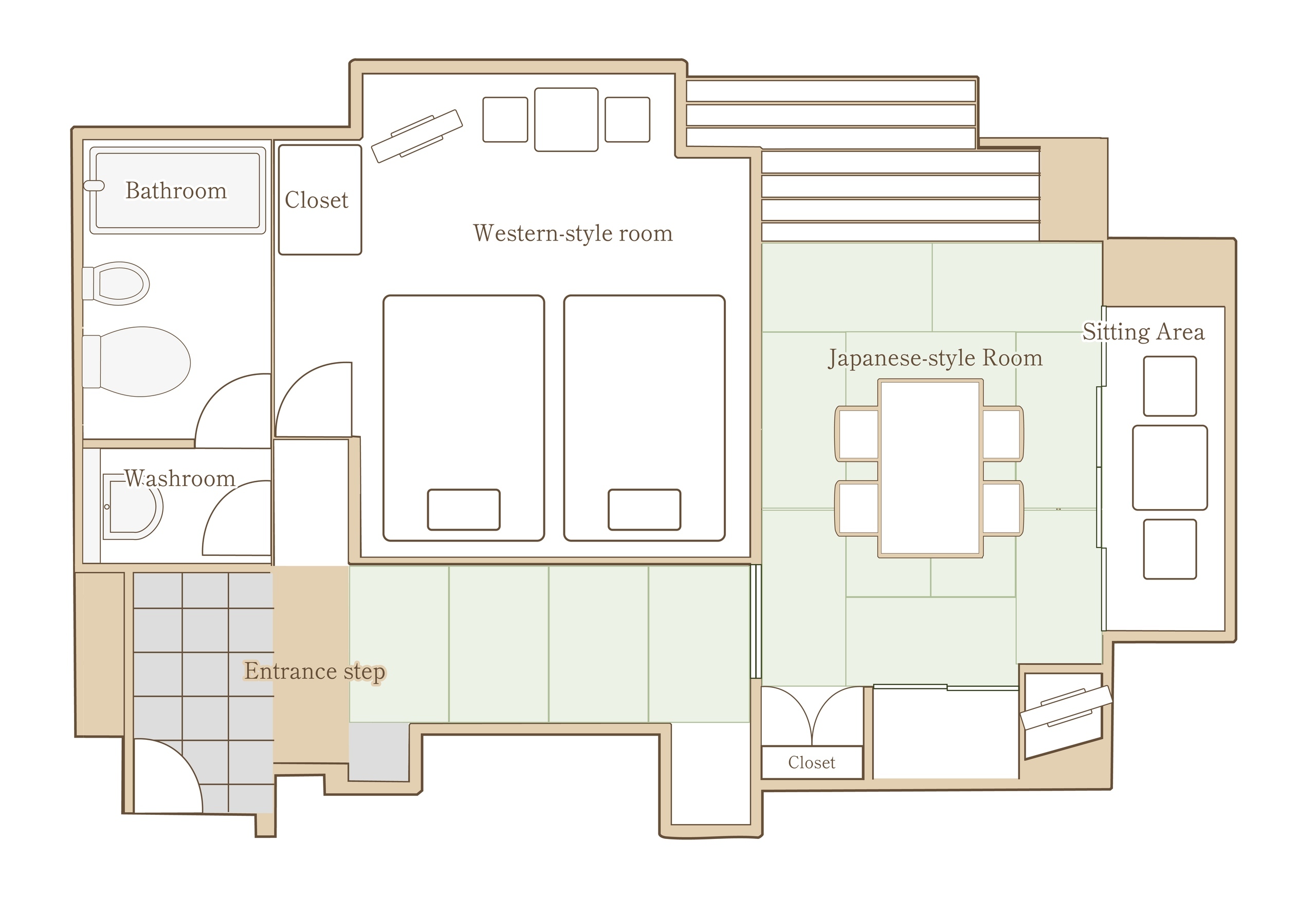 由10张榻榻米的和室和睡床房组成的豪华和洋合璧式客房,可欣赏多摩湖景、富士山和游乐场的优美风光。
