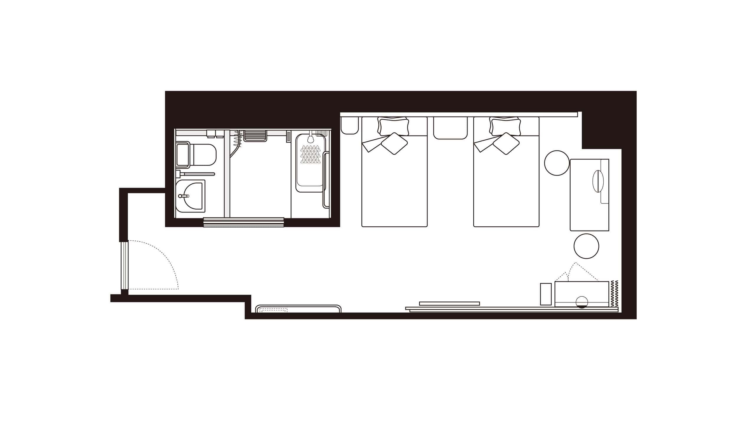楼层:5-7层 面积:36㎡ / 387sq.ft. 睡床尺寸:1200㎜×2060mm 可容纳人数:3人