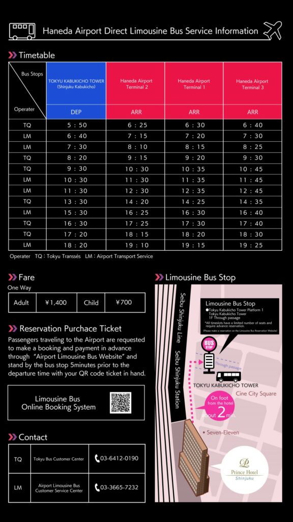 *从新宿王子大饭店到羽田机场可以乘坐从TOKYU KABUKICHO TOWER出发的机场巴士。到机场大约需要35到75分钟。从新宿王子大饭店到TOKYU KABUKICHO TOWER巴士乘车站大约需要步行2分钟(所有班车都是事先预约的座位)。