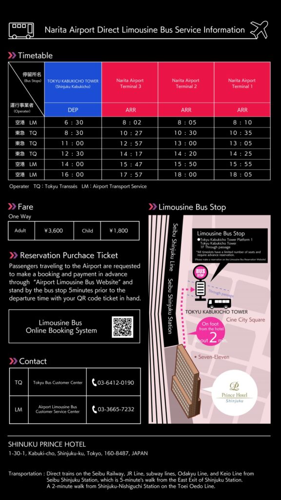 *从新宿王子大饭店到成田机场可以乘坐从TOKYU KABUKICHO TOWER出发的机场巴士。到机场大约需要85到145分钟。从新宿王子大饭店到TOKYU KABUKICHO TOWER巴士乘车站大约需要步行2分钟(所有班车都是事先预约的座位)。