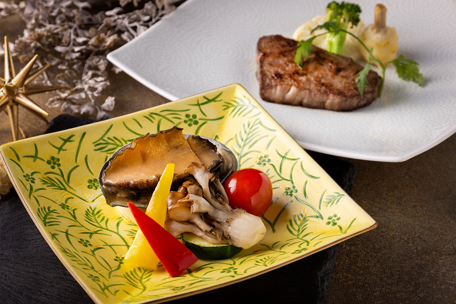 在圣诞期间,享用特别升级的套餐主菜:[山之恩恵]中的国产牛肉升级为米泽牛铁板烧。