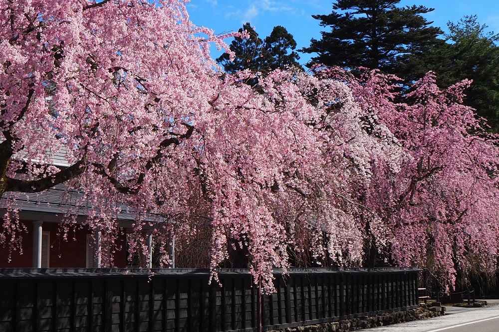 角馆武家屋敷400棵的垂枝樱盛开,倾泻在武士宅邸大街的黑色木栅栏上的景色十分壮丽。角馆樱花祭预计于樱花盛开时举行。