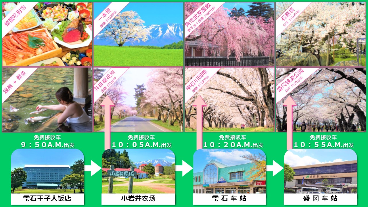 可搭乘从饭店到盛冈车站和小岩井农场的免费接驳车,享受赏樱之旅。饭店内有半露天温泉,温泉旁鲤鱼池,提供您边泡汤边欣赏鲤鱼的特别体验,晚餐还有自助餐螃蟹吃到饱等!除此之外,晚上还可以搭乘雫石银河缆车到标高730公尺处,欣赏满片星空及春季的星座。今年春天欢迎到日本东北的雫石来玩!