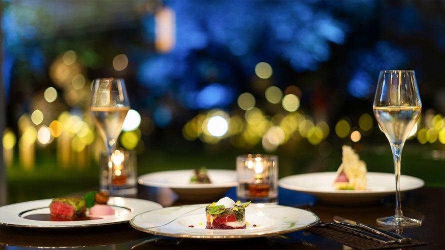 Indulge in a sumptuous four-course French dinner in our cosy lounge, bathed in the warm glow of twinkling bamboo lanterns cascading from the Japanese garden.