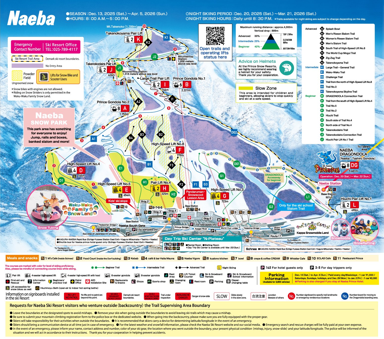 | E | 高速吊椅5号 | 4 | 654m | 8:30 A.M. ~ 5:00 P.M.(夜滑营业期间 至8:30 P.M.) |